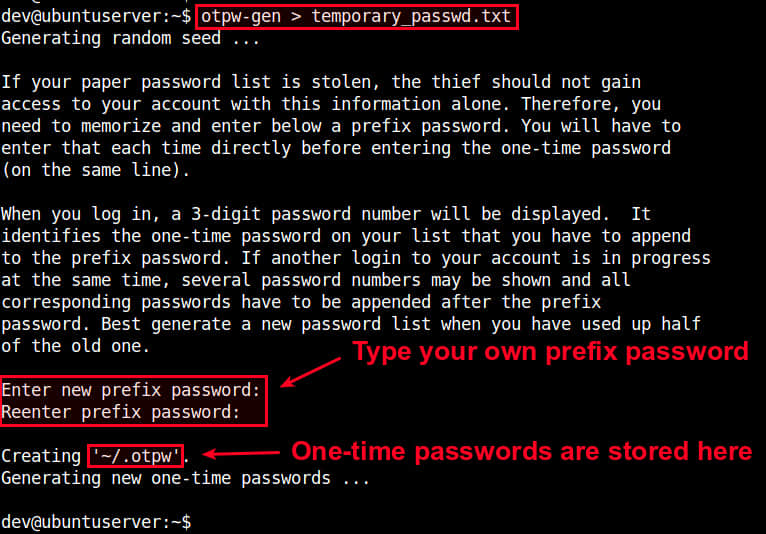 之前提到过,你需要事先创建一次性密码,并保存起来。使用 otpw-gen 命令创建密码: