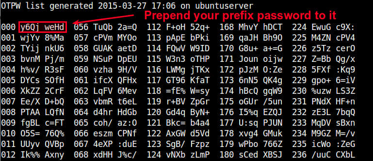 设置好密码前缀后,这个命令会产生 280 个一次性密码(LCTT 译注:保存到 ~/.otpw 下),并将它们导出到一个文本文件中(如 temporary_password.txt)。每个密码(默认是 8 个字符)由一个 3 位十进制数索引。你需要将这个密码表打印出来,并随身携带。